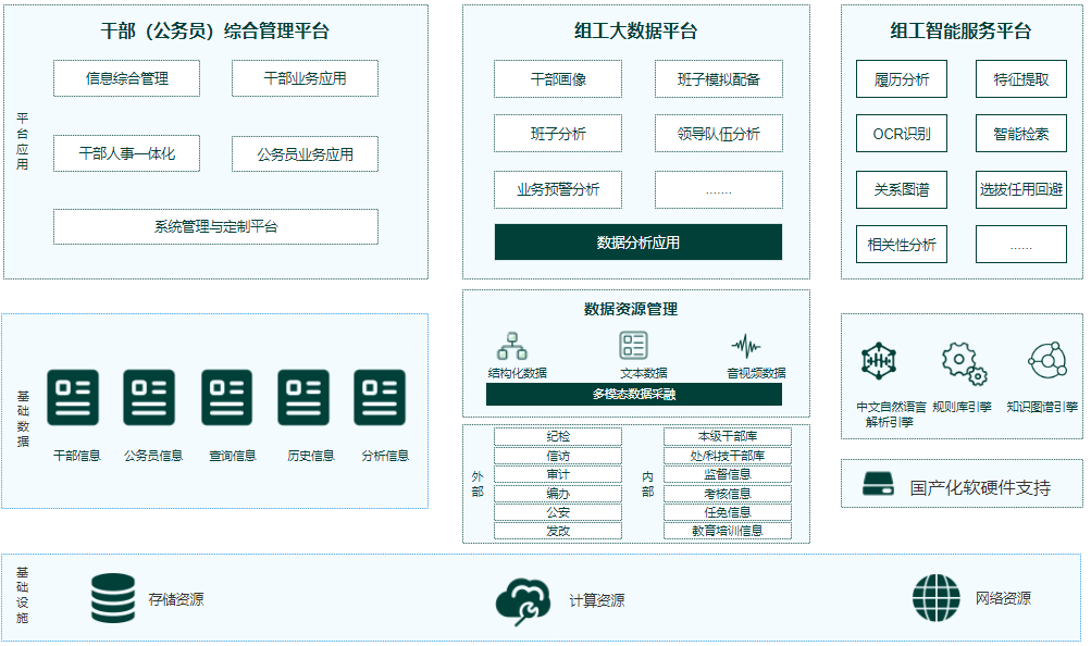 · 组工大数据平台用于对干部的分析研判,通过分析研判平台展现干部画像以及班子画像,利用科学的分析结果帮助组织工作者精准施策,实现从“经验决策”向“科学决策”的转变。