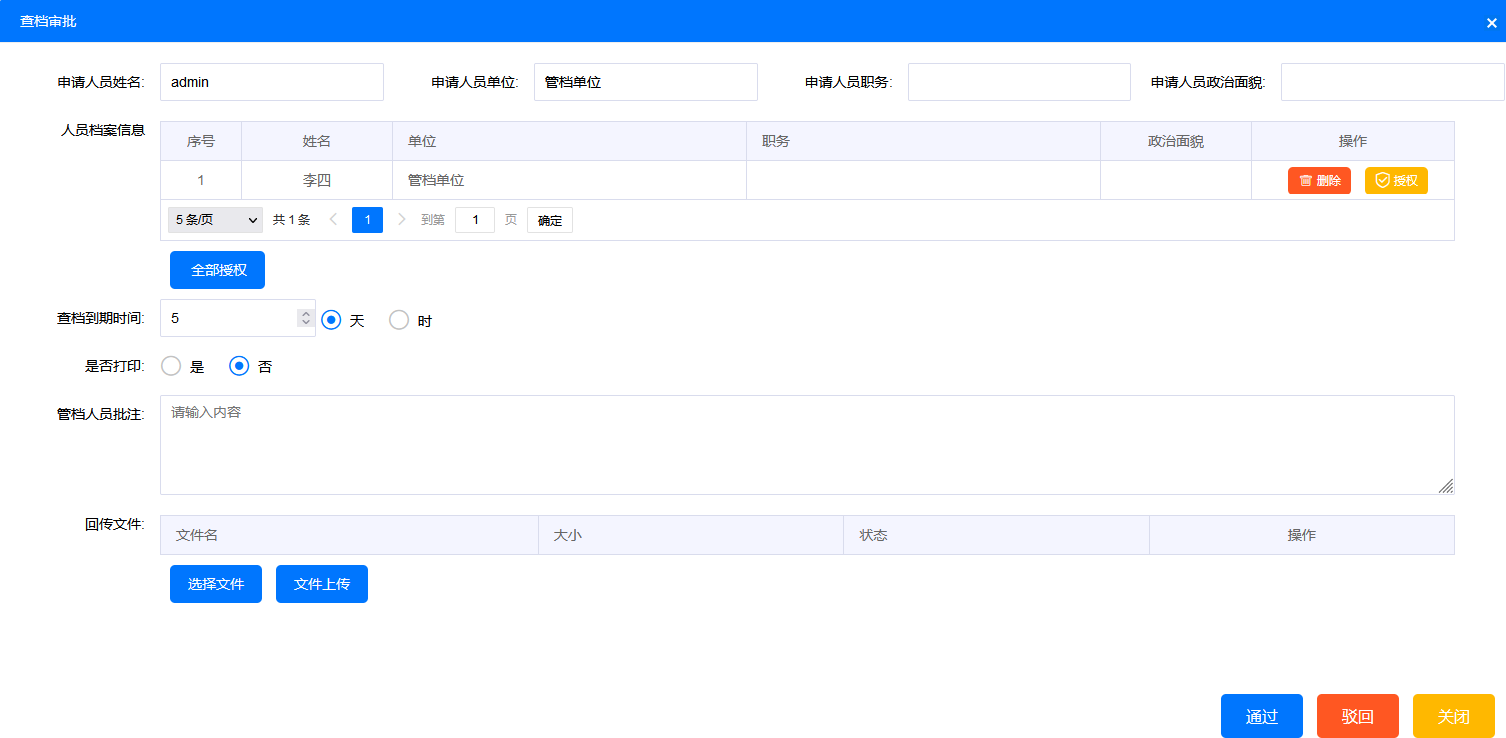 包含但不限于对档案信息维护、在线查阅档案、查借阅档案在线申请与审批、档案转递、散材料录入、打印档案审批等功能。